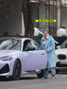Tânăra s-a oprit pentru a-și rezolva treburile, iar apoi a fost văzută relaxându-se la o cafenea, afișându-și mașina de lux și o elegantă blană albastră.