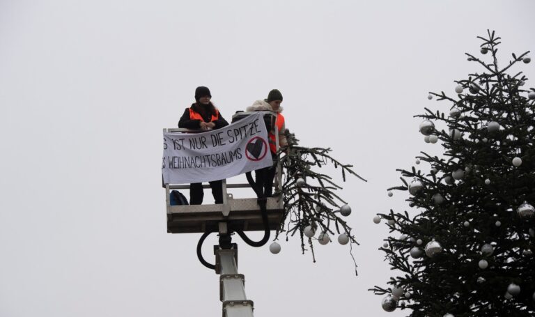 Activiştii pentru climă au tăiat cu fierăstrăul miercuri vârful pomului de Crăciun din faţa...
