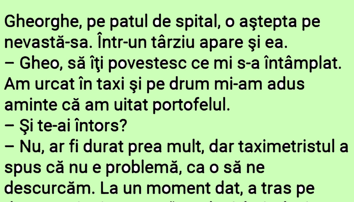 Bancul zilei. Gheorge e pe patul de spital și își așteaptă soția. În cele din urmă, apare și ea, pregătită să îi povestească ce a pățit pe drum, în taxi. Dialogul dintre cei doi stârnește amuzamentul! Spor la râs, dragi cititori!