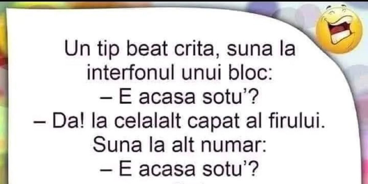 Bancul zilei. Este joi, se apropie finalul săptămânii de lucru, așa că este momentul să vă puneți zâmbetul pe chip. Un bărbat beat sună la interfonul unui bloc, cu speranța că va nimeri apartamentul corect. Spor la râs!