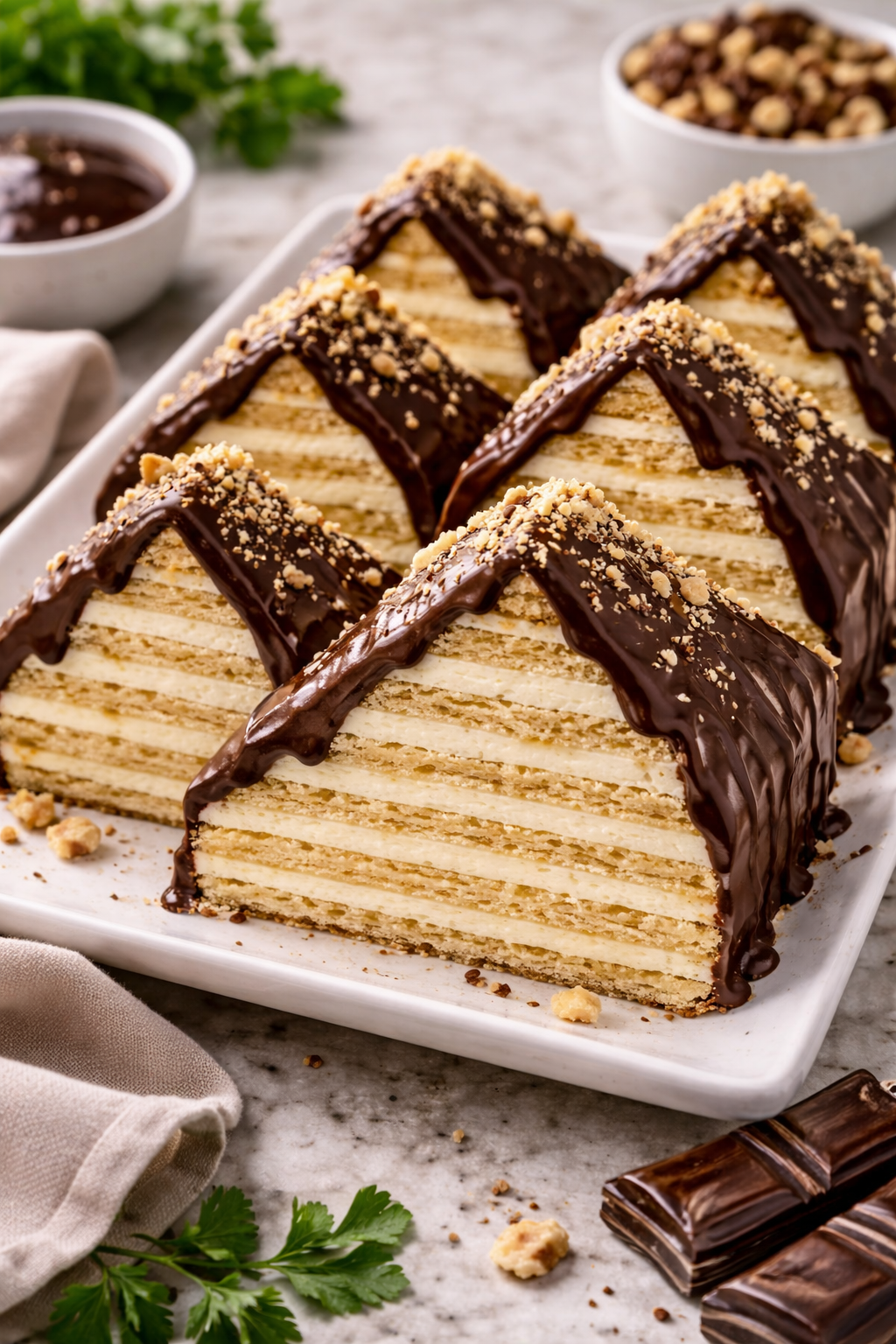 Preparatul îmbină armonios textura crocantă a foilor cu finetea cremei de vanilie sau ciocolată, iar aspectul său impunător îl face un desert spectaculos, ideal pentru mese festive sau pentru a impresiona invitații.