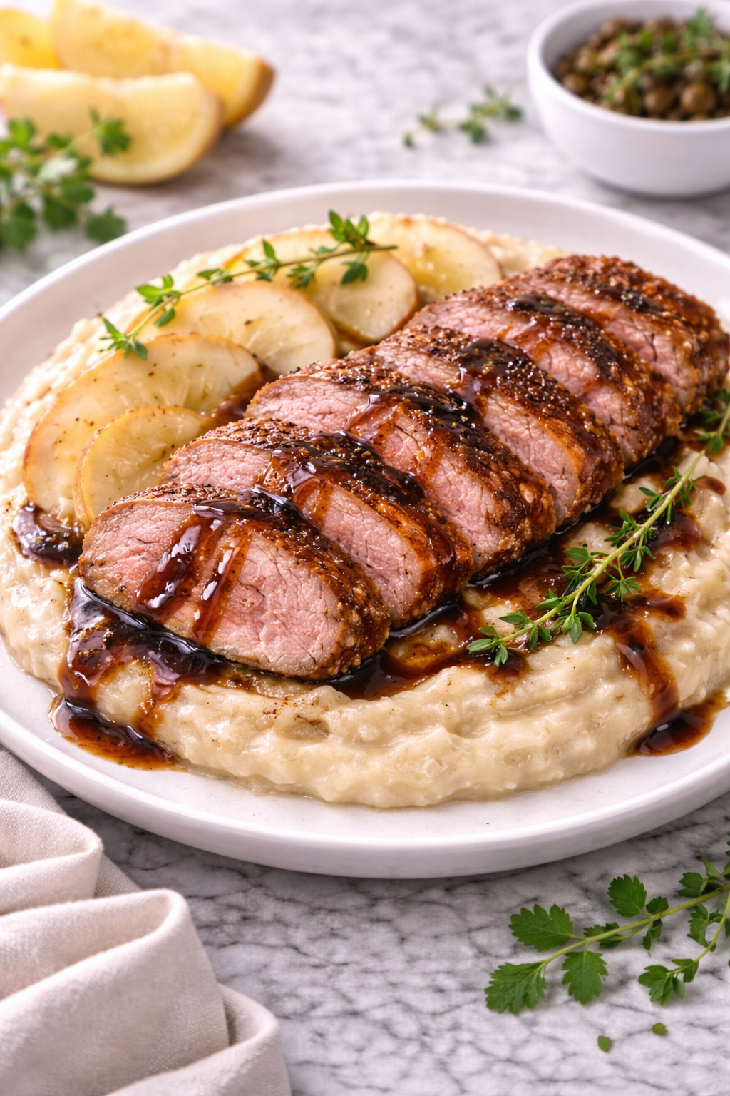 Rața crocantă cu sos balsamic și piure de țelină și mere este un preparat elegant, perfect pentru mesele festive sau pentru momentele în care vrei să impresionezi cu ceva special.