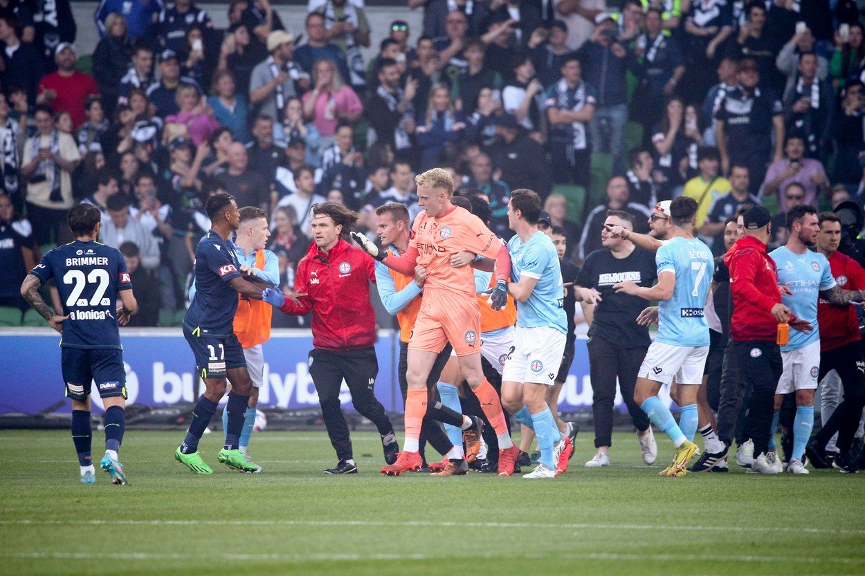 Derbiul orașului Melbourne a fost abandonat, după scene șocante care au avut loc sâmbătă seară, pe stadionul AAMI Park. Portarul echipei gazdă a fost atacat de către suporterii oaspeți și a părăsit terenul cu sânge pe față.
