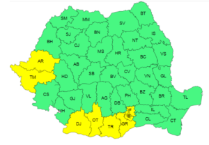 În unele județe, un cod galben de precipitații va intra în vigoare, aducând instabilitate atmosferică și ploi torențiale, dar canicula va continua să persiste în alte regiuni.